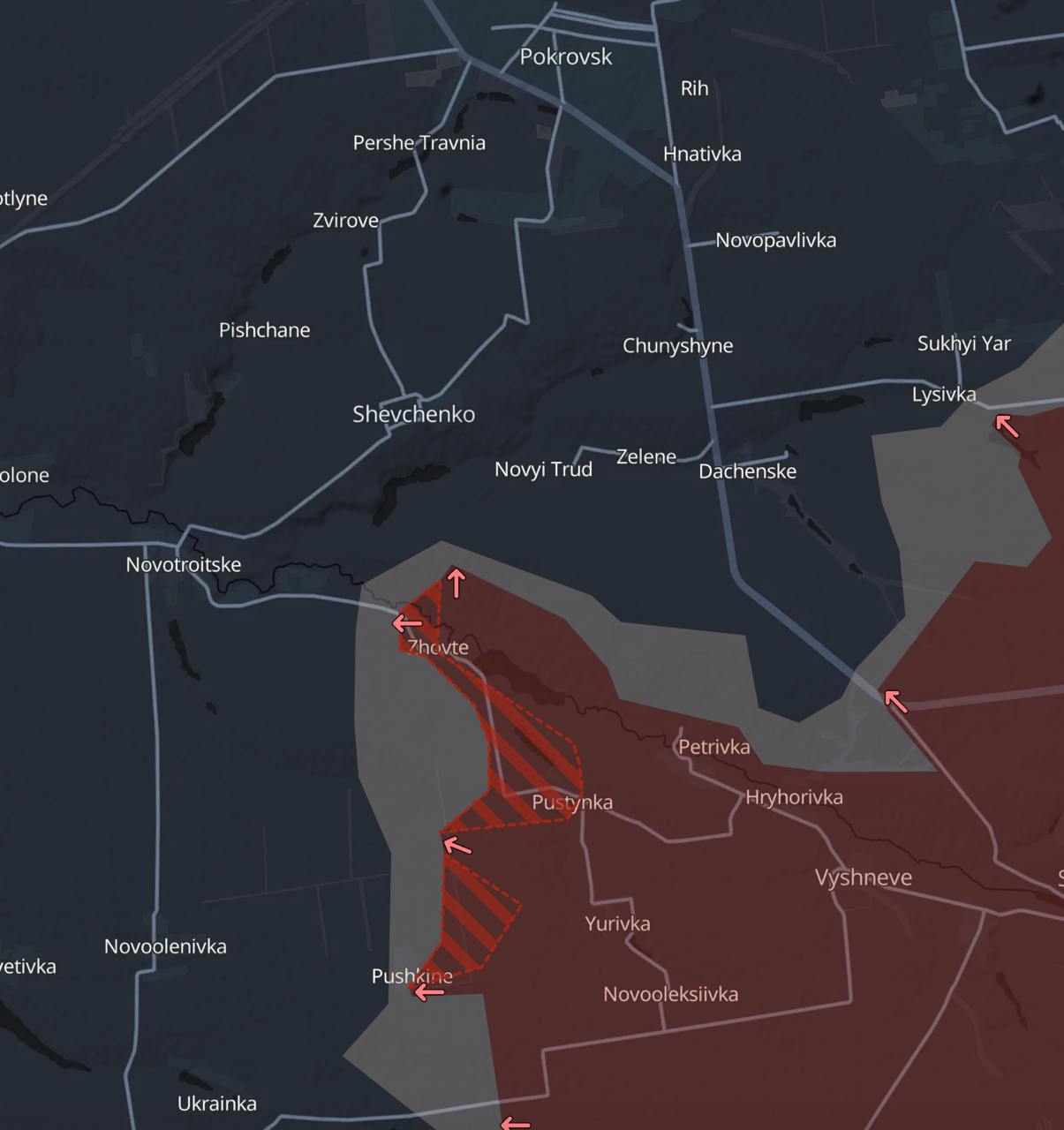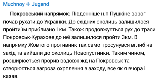 "На південь від населеного пункту Пушкіно ворог почав рухатися до Українки. До східних околиць залишилося пройти їм приблизно один кілометр. Також триває рух до траси Покровськ-Курахове, до неї залишилося пройти три кілометри. У напрямку Жовтого противник також просунувся вглиб на захід і вийшов до кок. Новопустинки Таким чином, розширюється прорив уздовж. залізниці на Покровськ і створюється загроза охоплення із заходу", - пише військовий у своєму телеграм-каналі.