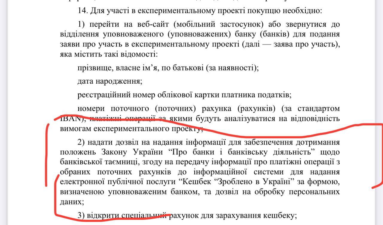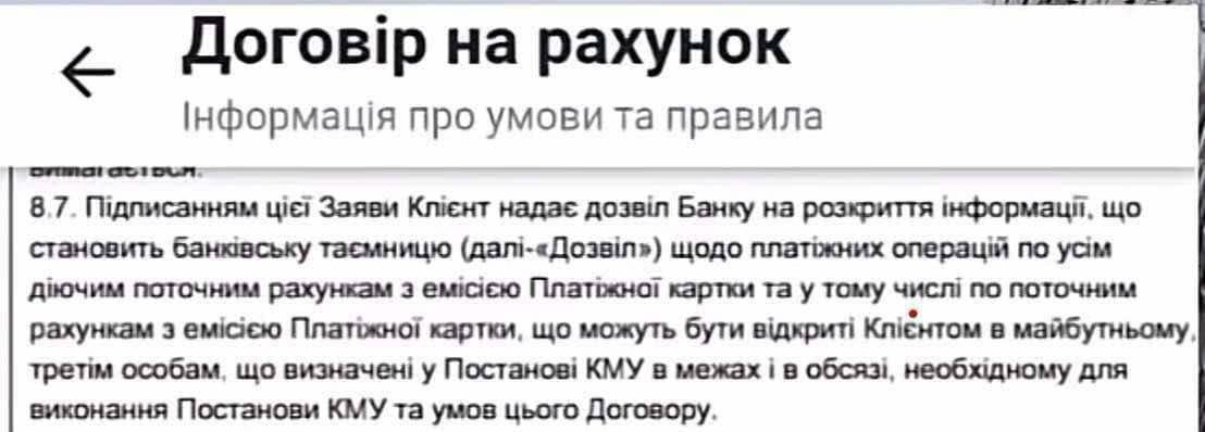 Він опублікував пункт із договору "Привату", який підписується під час відкриття картки "Національний кешбек", необхідної для отримання цієї тисячі гривень. У тексті прямим текстом зазначено, що, підписуючи договір, громадянин дає згоду на розкриття банківської таємниці про платіжні операції за всіма поточними рахунками, а також за рахунками, які можуть бути відкриті в майбутньому.