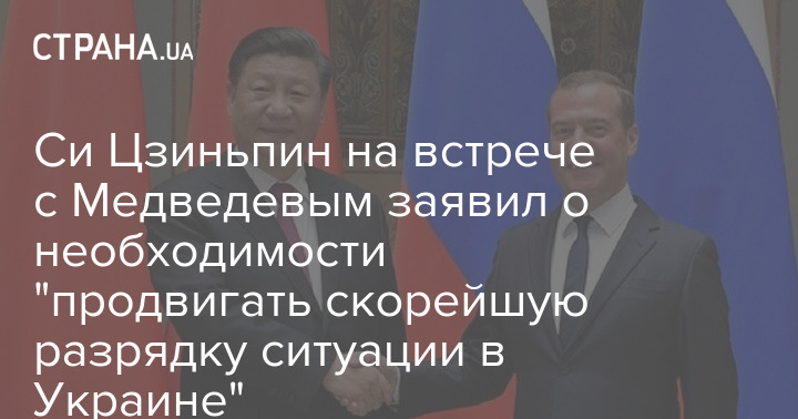 Голова Китаю Сі Цзіньпін на зустрічі із заступником голови Ради безпеки Росії Дмитром Медведєвим заявив про необхідність "просувати швидку розрядку ситуації в Україні".
