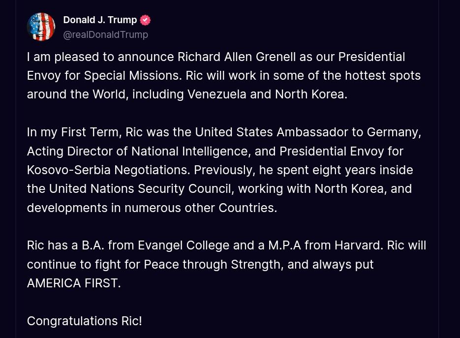 Чи Гренелл на новій посаді займатиметься Україною, поки не ясно.