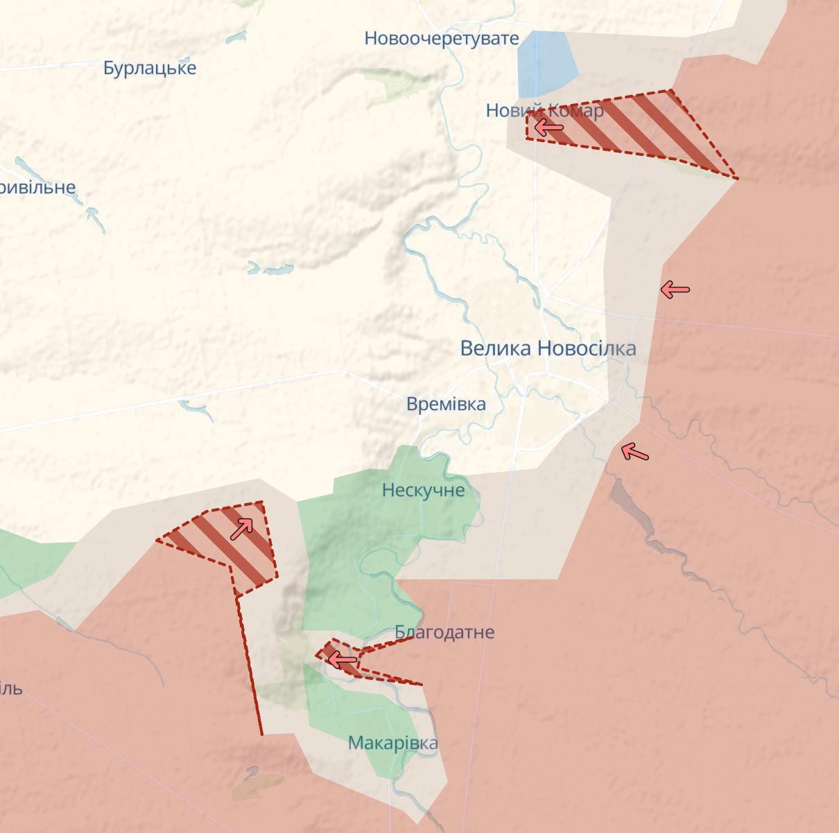 Там росіяни вчора знову прорвалися до села Новий Комар, через яке проходить дорога до Новосілки з півночі. Вони закріпилися в частині села та намагаються витісняти з нього частини ЗСУ. Нагадаємо, нещодавно армія РФ вже заходила до Нового Комару, але була звідти вибита.