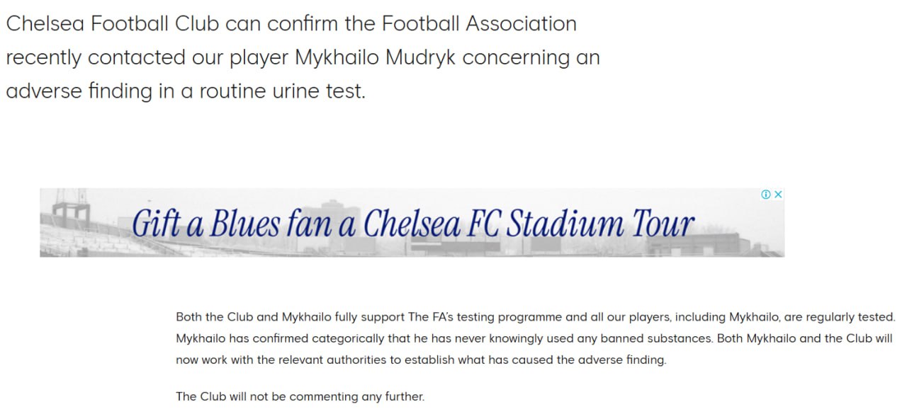 "Футбольний клуб "Челсі" може підтвердити, що Футбольна асоціація нещодавно зв'язалася з нашим гравцем Михайлом Мудриком щодо несприятливого результату аналізу сечі", - йдеться в офіційній заяві клубу.