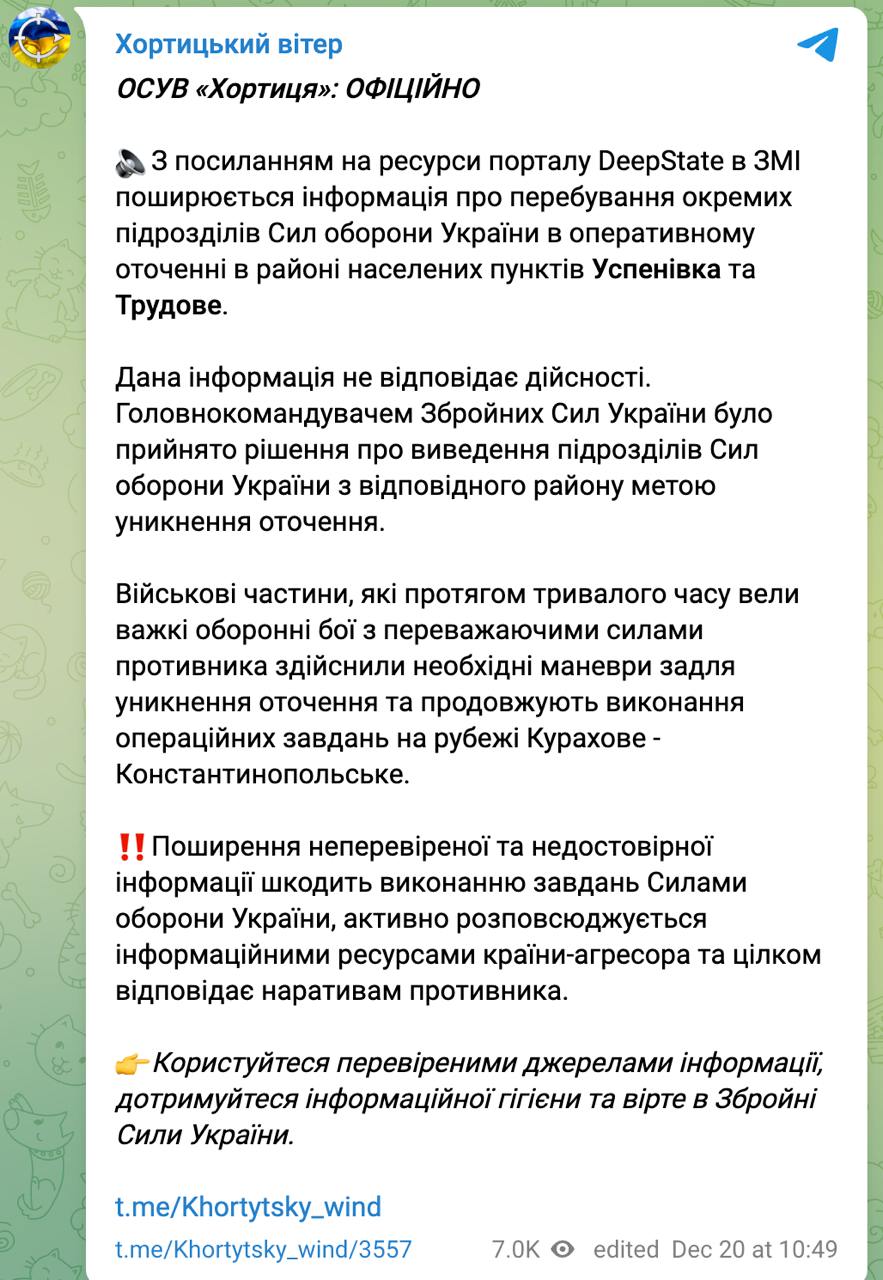 "З посиланням на ресурси порталу DeepState у ЗМІ поширюється інформація про перебування окремих підрозділів Сил оборони України в оперативному оточенні в районі населених пунктів Успенівка та Трудове. Ця інформація не відповідає дійсності. Головнокомандувачам Збройних Сил України було ухвалено рішення про виведення підрозділів Сил оборони України з відповідного району, щоб уникнути оточення.