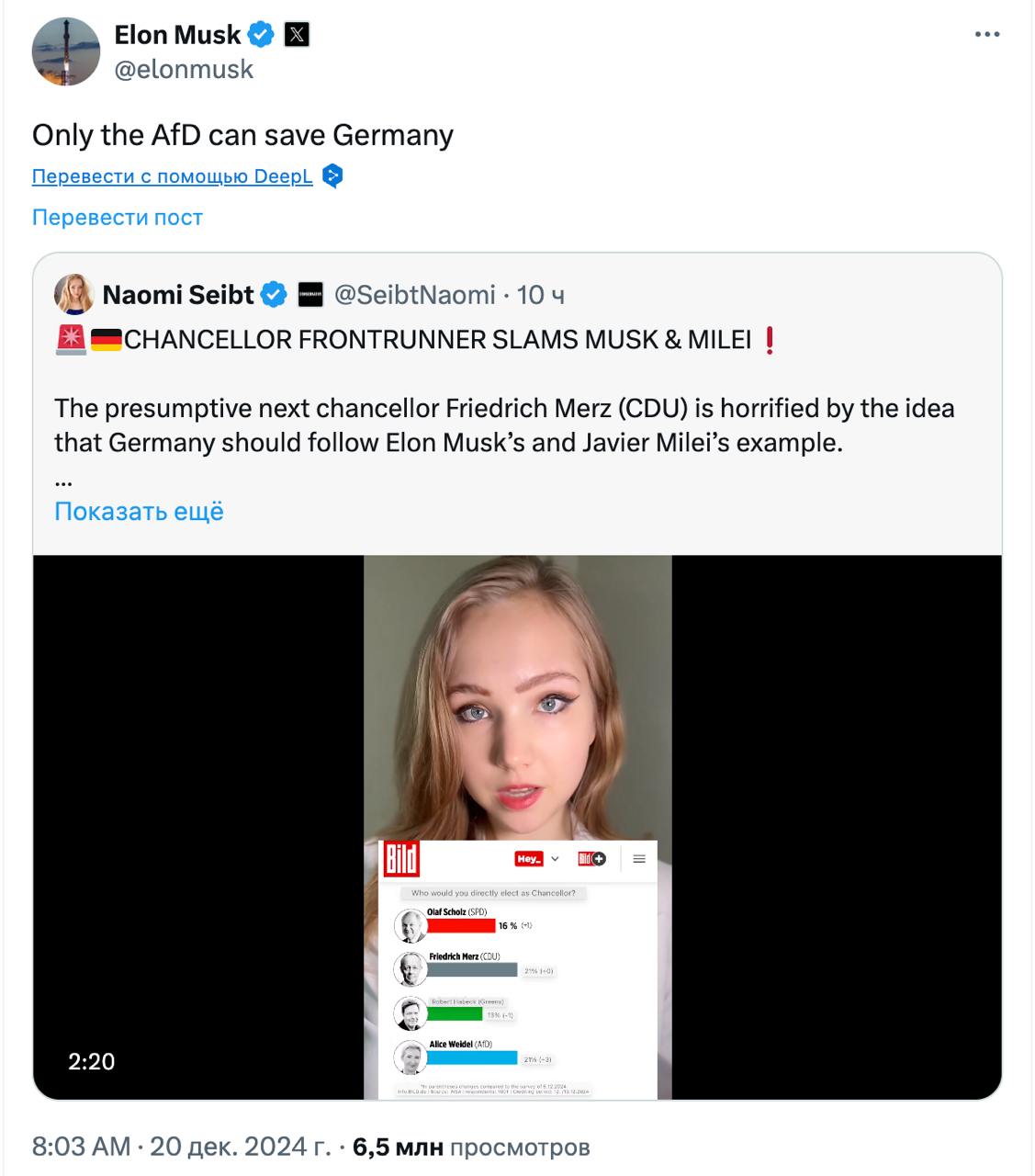 Так бізнесмен із команди обраного президента США Дональда Трампа прокоментував перебіг передвиборної кампанії у ФРН і пост із критикою кандидата в канцлери Фрідріха Мерця з Християнсько-демократичного союзу (ХДС) за небажання формувати коаліцію з "АдГ".