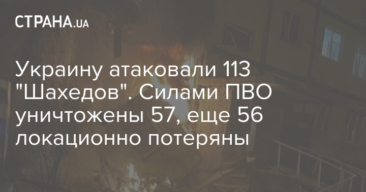 Сьогодні вночі РФ атакувала Україну зенітною керованою ракетою С-400 та 113 ударними БпЛА типу "Shahed" та безпілотниками інших типів. Збили 57 та ще 56 локаційно втрачені, не досягнувши своїх цілей.