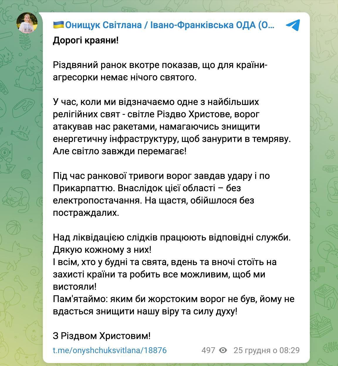 У середу, 25 грудня, в Україні триває 1036-й день війни з Росією. Близько 6:00 Росія розпочала масовану атаку на різні об'єкти по всій країні.