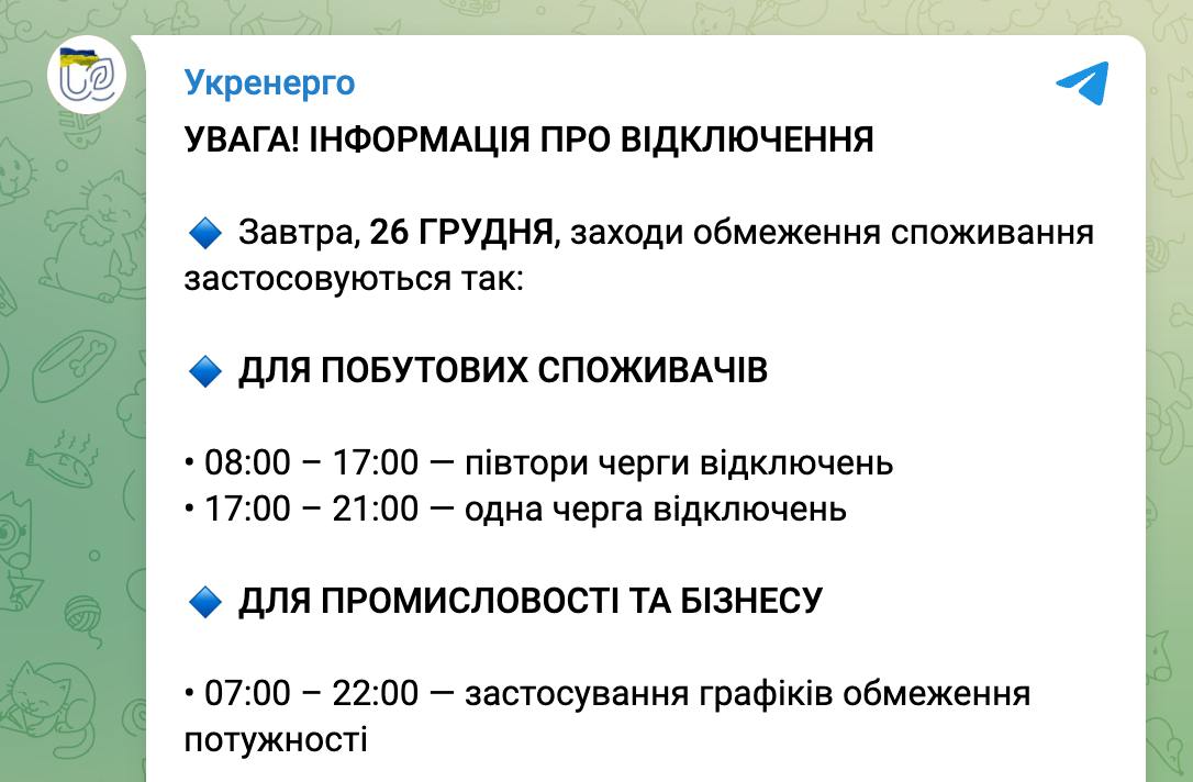"У зв'язку з масштабною ракетною атакою застосовані заходи щодо обмеження споживання. Графіки відключень у вашому регіоні дізнавайтеся на сайті та офіційних сторінках вашого обленерго", - повідомляє Укренерго.