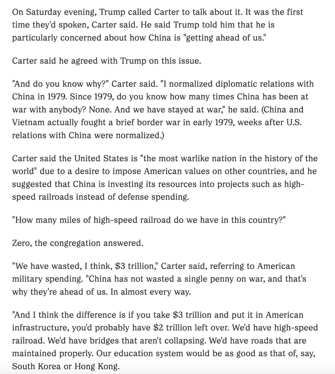 "І знаєш, чому? - сказав Картер. - Я нормалізував дипломатичні відносини з Китаєм у 1979 році. Чи знаєте ви, з 1979 року Китай з ким би там не був у стані війни? Жодної. А ми залишилися у стані війни", - сказав він (зазначимо, що Китай і В'єтнам все ж таки вели коротку прикордонну війну на початку 1979 року).