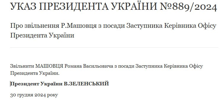 "Звільнити Машовця Романа Васильовича з посади заступника керівника Офісу президента України", - йдеться у документі.