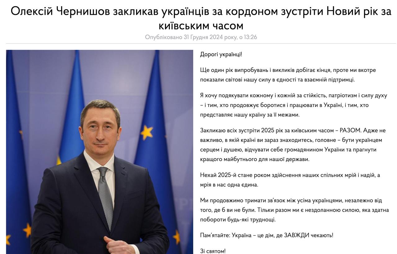 Глава новоствореного Міністерства національної єдності Олексій Чернишов закликав українців за кордоном зустріти Новий рік за київським часом.