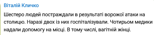 Кличко додав, що в результаті атаки дронів постраждали шестеро людей, двоє з них госпіталізовані. Іншим надано медичну допомогу на місці, у тому числі вагітній жінці.