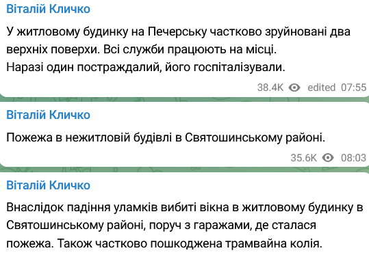 Так, за його словами, у житловому будинку в Печерському районі частково зруйновано два верхні поверхи, пошкоджено і нежитлову будівлю.
