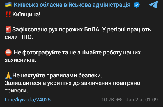 "Київська область! Зафіксовано рух ворожих БПЛА! У регіоні працюють сили ППО", - йдеться у повідомленні.