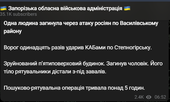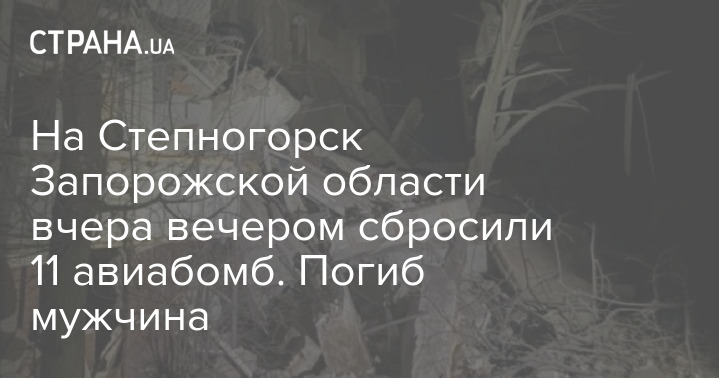 Учора ввечері на Степногірськ Запорізької області росіяни скинули 11 авіабомб. Зруйновано п'ятиповерховий житловий будинок. Загинув чоловік.
