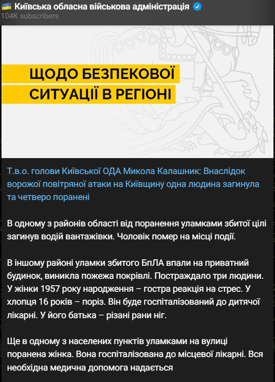 Внаслідок російської повітряної атаки на Київську область одна людина загинула і четверо поранені. Про це повідомляє Київська ОВА.