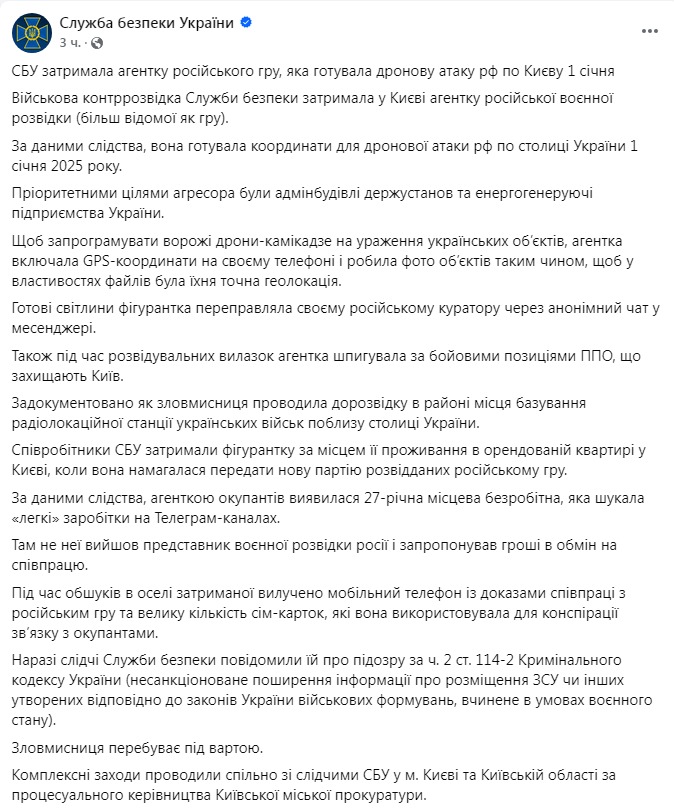 Затримано 27-річну жінку, яка незадовго до удару по урядовому кварталу "Шахедами" 1 січня проводила там розвідку. Зазначається, що вона робила фотографії з прив'язкою геолокації та скидала їх своєму російському куратору в анонімному чаті.