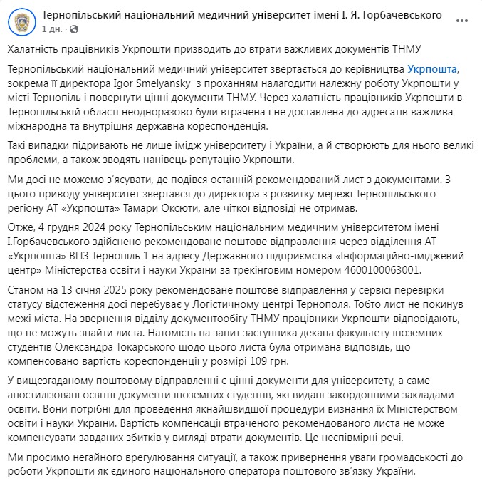 "Тернопільський національний медичний університет звертається до керівництва "Укрпошти", зокрема, її директора Ігоря Смілянського з проханням налагодити належну роботу "Укрпошти" у місті Тернопіль та повернути цінні документи ТНМУ. Через недбалість працівників "Укрпошти" в Тернопільській області неодноразово втрачали не доставляли адресатам важливу міжнародну та з цього приводу університет звертався до директора розвитку мережі Тернопільського регіону АТ "Укрпошта" Тамарі Оксюте, але чіткої відповіді не отримав", - сказано в публікації.