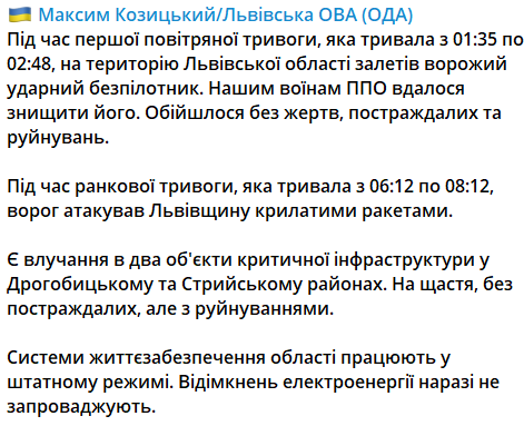 У Львівській області внаслідок ранкової ракетної атаки пошкоджено два об'єкти критичної інфраструктури у Дрогобицькому та Стрийському районах. Обійшлося без постраждалих.