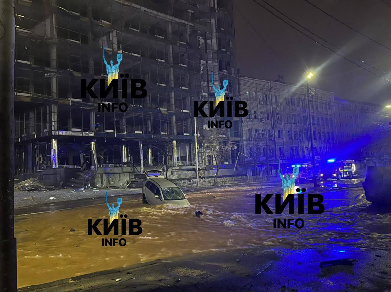 А після прориву труб внаслідок обстрілу вулицями мчить потік води. У ньому тонуть автомобілі.