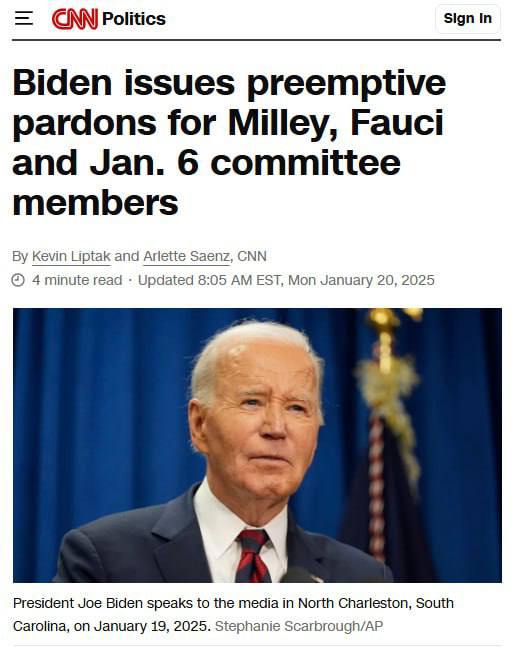 Тим часом Байден свого останнього дня в Білому домі превентивно помилував генерала Марка Міллі, доктора Ентоні Фаучі та членів Конгресу, які розслідували штурм Капітолію, - для захисту від "помсти" Трампа, як повідомляє СNN.