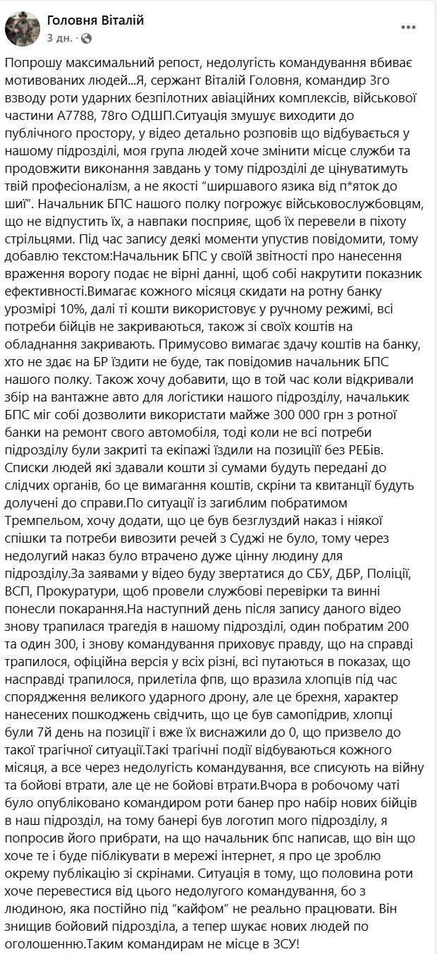 Головня стверджує, що начальник так "за*бал людей", що деякі самопідриваються під час виконання завдань, перебуваючи по 7 днів на позиції, де їх "виснажили в 0" Офіційно заявляється, що ця людина загинула від прильоту ФПВ.