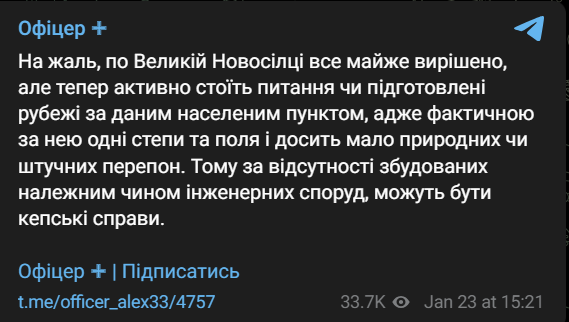 Лейтенант ЗСУ Алекс пише, що "по Великій Новосілці все майже вирішено", і тепер питання у кількості фортифікацій на північ, адже "за нею одні степи і поля і мало природних чи штучних перешкод", і без побудованих належним чином інженерних споруд "можуть бути погані" справи".