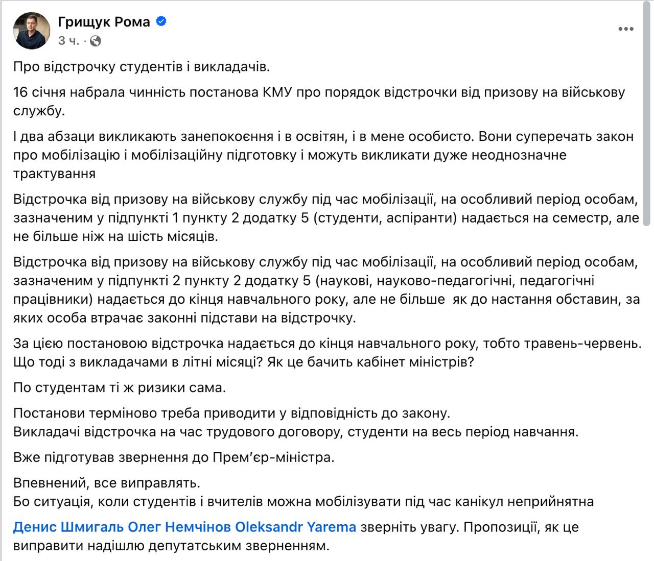 "За цією постановою відстрочка надається до кінця навчального року, тобто травень-червень. Що тоді з викладачами у літні місяці? За студентами ті ж ризики", - пише Грищук.