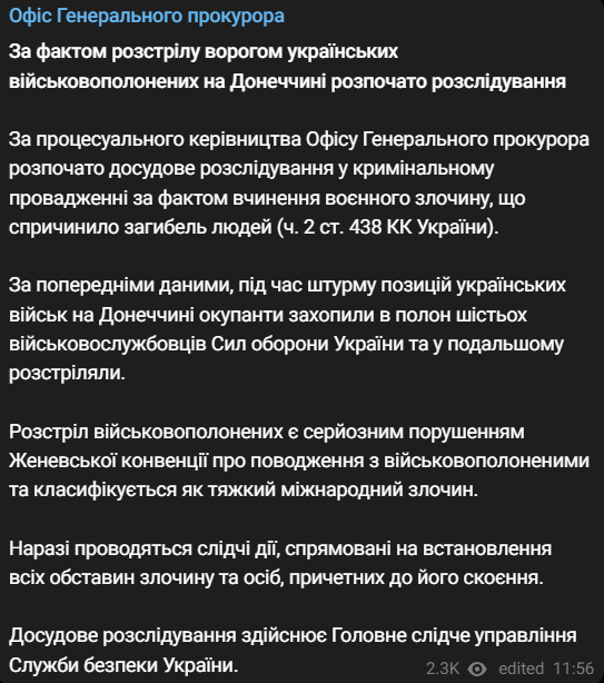 "Розстріл військовополонених є серйозним порушенням Женевської конвенції про поводження з військовополоненими та класифікується як тяжкий міжнародний злочин", - нагадують у прокуратурі.