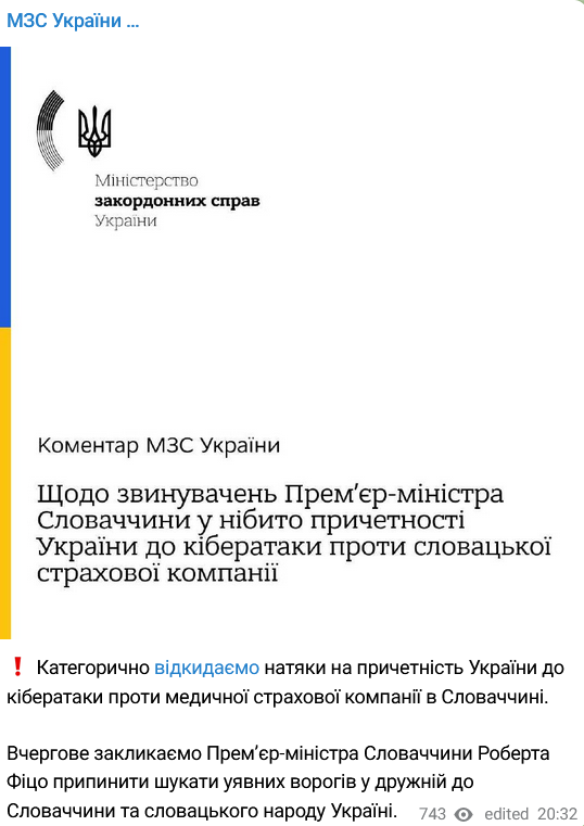 "Категорично відкидаємо натяки на причетність України до кібератаки проти медичної страхової компанії у Словаччині", – заявили у МЗС.