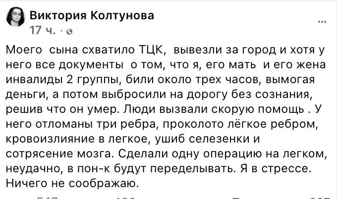 "Мого сина схопило ТЦК, вивезли за місто і хоча у нього всі документи про те, що я, його мати та його дружина інваліди 2 групи, били близько трьох годин, вимагаючи гроші, а потім викинули на дорогу непритомною, вирішивши, що він помер. Люди викликали швидку допомогу. У нього відламані три ребра, проколота легеня ребром, крововилив у легеню, забій селезінки та струс мозку. Зробили одну операцію на легені, невдало, у понеділок перероблятимуть. Я у стресі. Нічого не розумію", - пише вона.