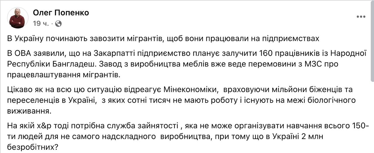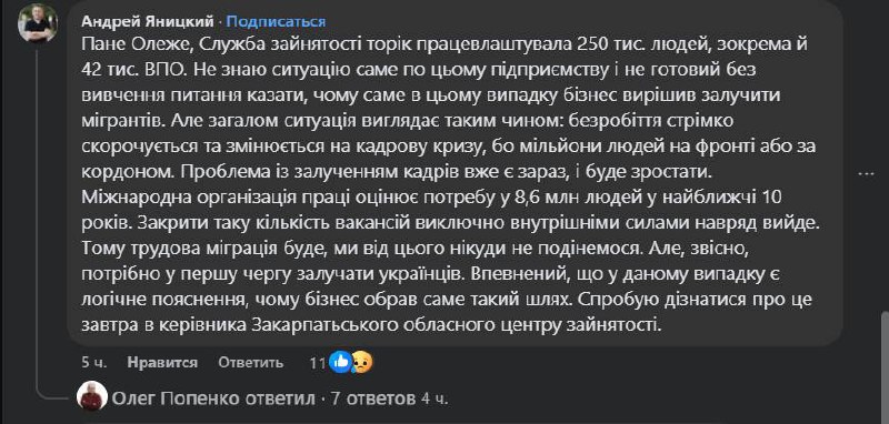 "Не знаю ситуацію саме щодо цього підприємства і не готовий без вивчення питання говорити, чому саме в цьому випадку бізнес вирішив залучити мігрантів. Але загалом ситуація виглядає так: безробіття стрімко скорочується і змінюється на кадрову кризу, бо мільйони людей на фронті чи за кордоном. Проблема із залученням кадрів є вже зараз, і зростатиме... Тому трудова міграція буде, ми від цього нікуди не подінемось", – написав голова департаменту комунікацій Державної служби зайнятості Андрій Яницький.