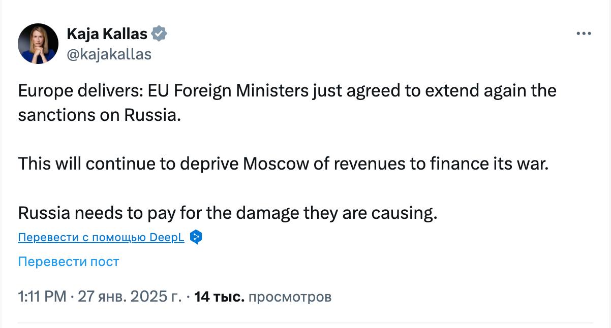 "Європа справляється: міністри закордонних справ ЄС щойно погодилися знову продовжити санкції проти Росії. Це продовжить позбавляти Москву доходів для фінансування її війни. Росія має заплатити за шкоду, яку вона завдає", - написала чиновниця.