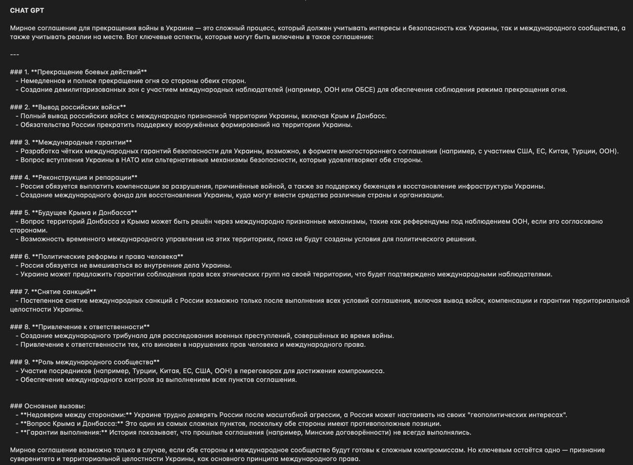 У першому пункті угоди обидва ІІ-клієнти практично збіглися: вони пропонують закінчити бойові дії та запровадити моніторингові групи з ООН на лінію розмежування. При цьому ChatGPT хотів би там бачити сили ще й ОБСЄ, а DeepSeek – "нейтральні країни".