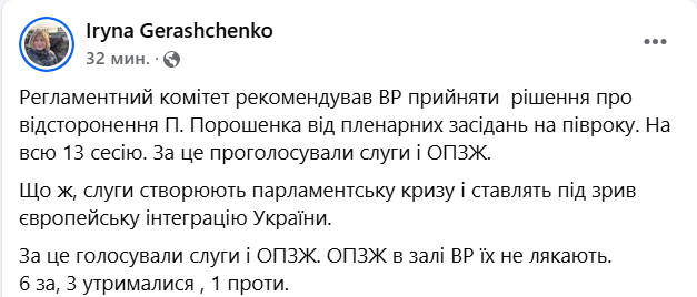 За відповідну рекомендацію проголосував регламентний комітет парламенту, повідомляє Ірина Геращенко.