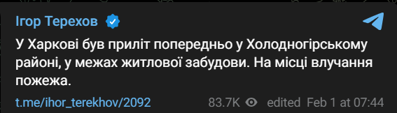 "Внаслідок атаки на Харків одна людина загинула, а четверо поранені", - написав він.