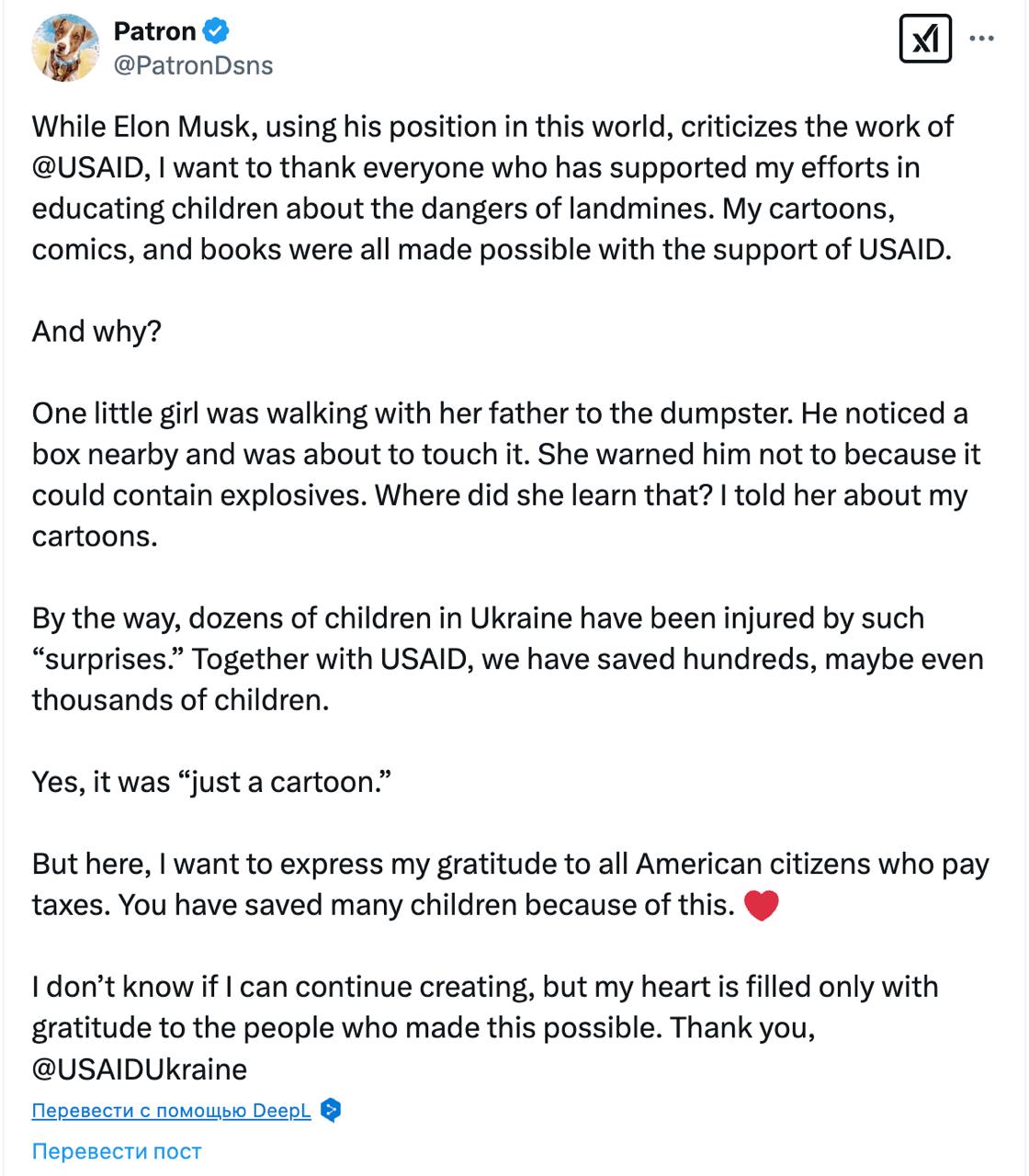"Поки Ілон Маск, користуючись своїм становищем у цьому світі, критикує роботу USAID, я хочу подякувати всім, хто підтримав мої зусилля щодо освіти дітей про небезпеку протипіхотних мін. Мої мультфільми, комікси та книги стали можливі завдяки підтримці USAID....Десятки дітей в Україні постраждали від таких "сюрпризів" (мін - Ред. ). Разом з USAID ми врятували сотні, може, навіть тисячі дітей. дітей. Не знаю, чи зможу я продовжувати творити, але моє серце наповнене лише вдячністю до людей, які зробили це можливим. USAIDUkraine", - сказано в публікації Патрона.