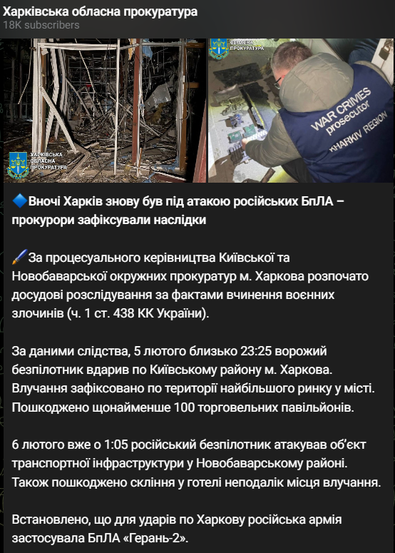 Близько 23:25 ворожий безпілотник вдарив Київським районом. Потраплення зафіксовано територією найбільшого ринку в місті Барабашово. Пошкоджено щонайменше 100 торгових павільйонів.