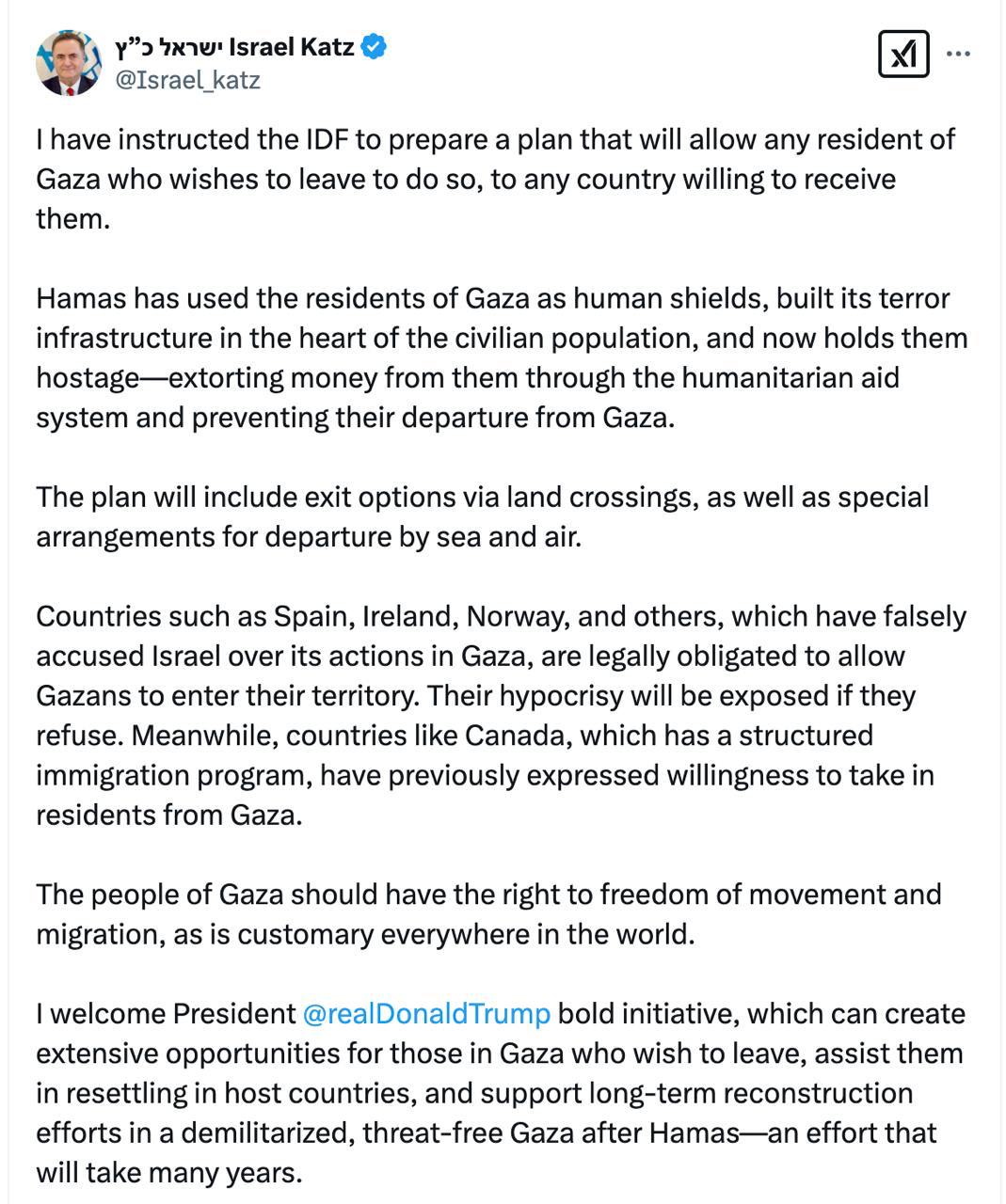 Водночас міністр оборони Ізраїлю Ісраель Кац повідомив, що вже доручив армії розробити план реалізації ідеї Трампа переселити палестинців із сектору Гази до інших країн, а цю територію взяти під американський контроль.