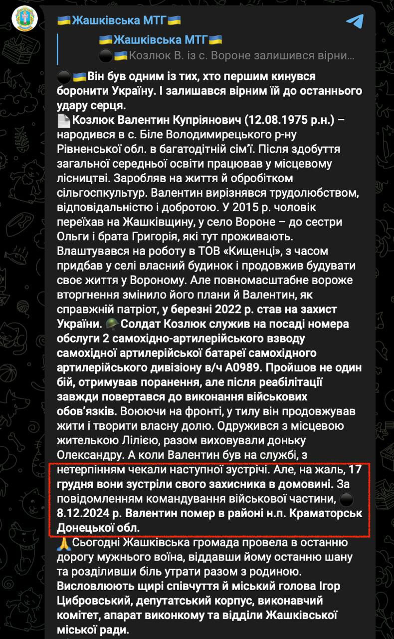 У повідомленні громади говорилося, що Козлюк, який пішов на фронт ще у березні 2022 року, загинув у Краматорську 8 грудня 2024 року. Причина смерті не називалася.