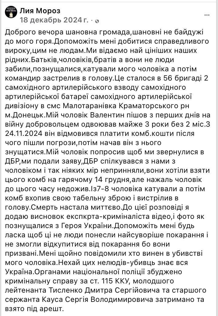 Жінка стверджує, що напередодні з нього знущався сам комбат Дмитро Тесленко, а також старший сержант Сергій Каус. На опублікованих фотографіях тіла можна побачити сліди побоїв і тортур.