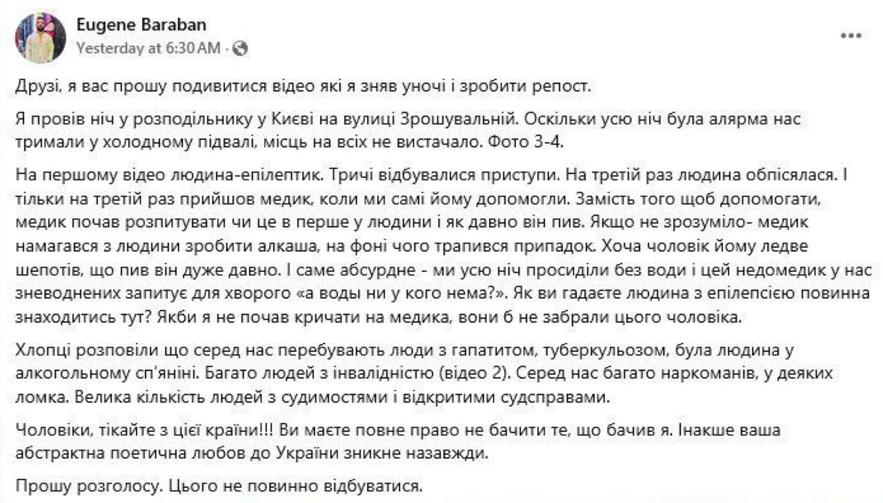 Члени військово-лікарської комісії оголосили йому, що роблять свій висновок на підставі електронної бази eHealth, де не було жодних даних про перенесення раніше Барабаном операцій та наявність дефектів серця. Після чого Євгена "запхали в намиста" і відвезли з Солом'янського ТЦК на розподільчий пункт по вулиці Зрошувальна (виклик поліції не допоміг, бо вбрання просто не пустили до ТЦК).