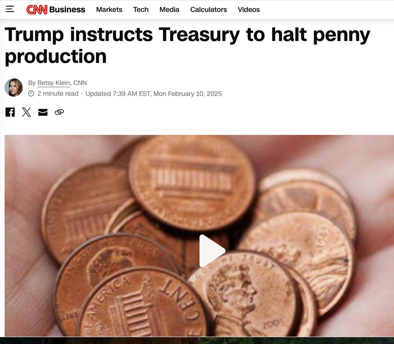 Президент США Дональд Трамп розпорядився припинити карбування монет номіналом один цент, заявивши, що їхнє виробництво коштує більше двох центів.