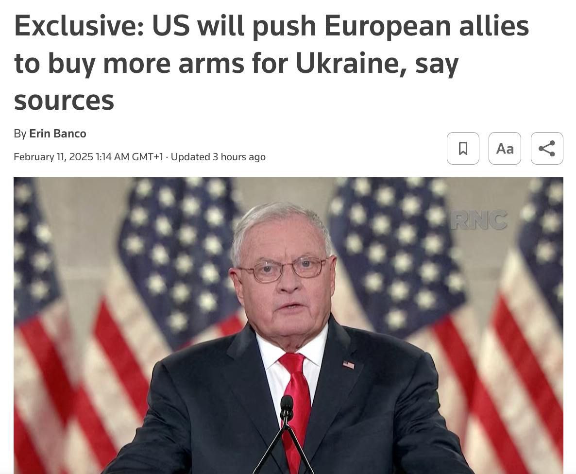 Це питання обговорюватиме представник Трампа Кіт Келлог під час зустрічей у Європі цього тижня, пише агентство. Келлог відмовився підтвердити план, але сказав: "США завжди люблять продавати зброю, виготовлену в Америці, тому що вона зміцнює нашу економіку". Також він сказав, що є багато варіантів домовленостей з цього питання.