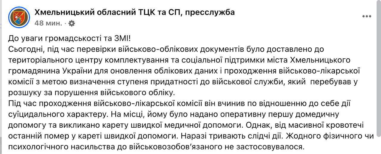 "Під час проходження військово-лікарської комісії він вчинив по відношенню до себе дії суїцидального характеру. На місці йому було надано оперативну першу домедичну допомогу та викликано карету швидкої медичної допомоги. Однак від сильної кровотечі останній помер у кареті швидкої допомоги", - йдеться в публікації.