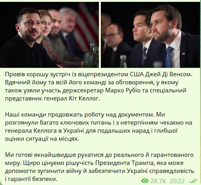 Після зустрічі Венс заявив про необхідність переговорів України з Росією. За його словами, важливо, щоб Київ та Москва почали між собою контакти. Ще він повідомив, що Рубіо та Келлог увійдуть до складу делегації США під час переговорів про мир.