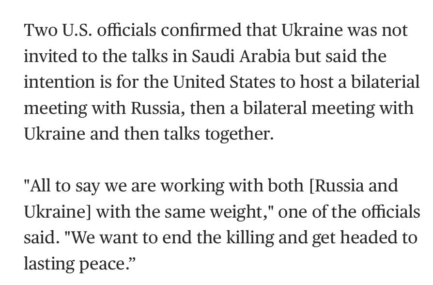 "Все, щоб сказати, що ми працюємо як з [Росією, так і з Україною] однаково. Ми хочемо покласти край вбивствам і вирушити до міцного світу", - сказав співрозмовник телеканалу, виходячи з чого стає зрозуміло, що США відкинули вимогу Зеленського не проводити жодних зустрічей з росіянами доти, доки не буде.