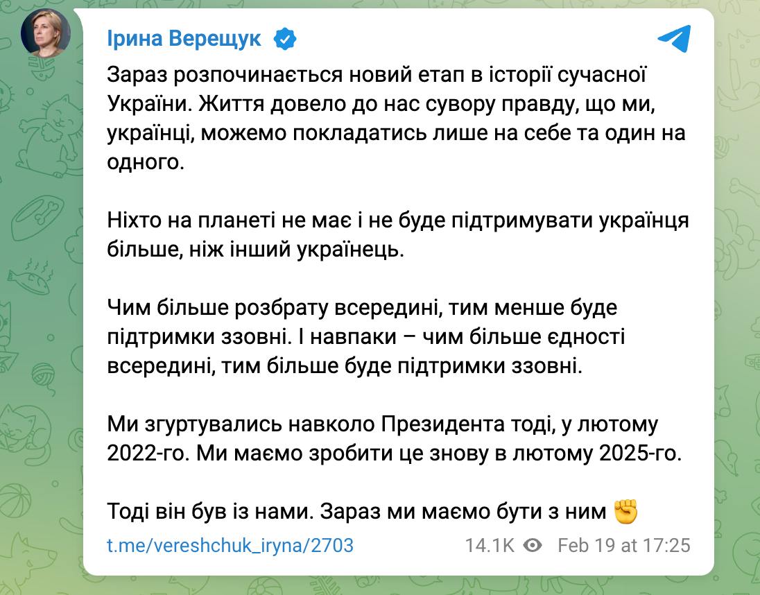 "Ми згуртувалися навколо президента тоді, у лютому 2022-го. Ми маємо зробити це знову у лютому 2025 року. Тоді він був з нами. Зараз ми маємо бути з ним", - написала чиновниця.
