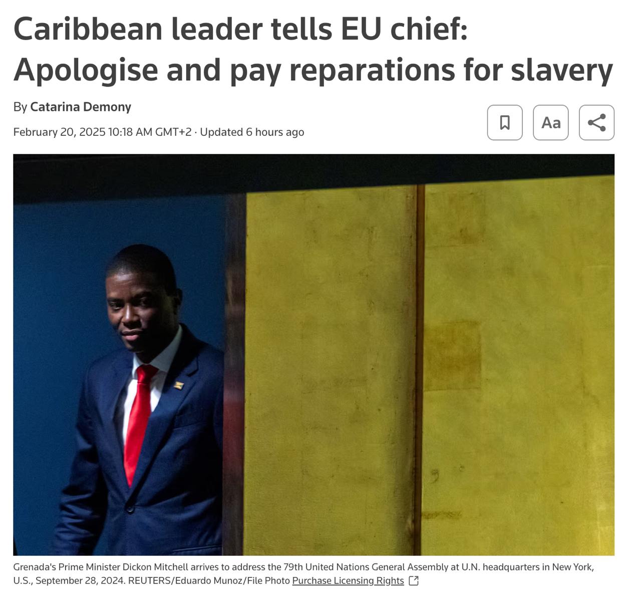 Лідер країн Карибського басейну та прем'єр-міністр Гренади Дікон Мітчелл звернувся до голови Єврокомісії Урсули фон дер Ляйєн із закликом вибачитися та виплатити репарації за рабство.