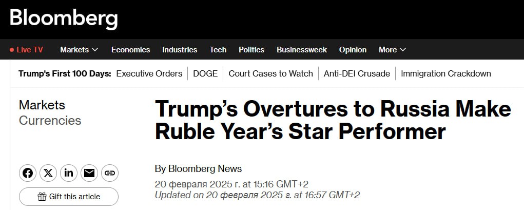 Рубль зміцнюється на тлі російсько-американських переговорів, які відбулися 18 лютого у Саудівській Аравії, пише видання.