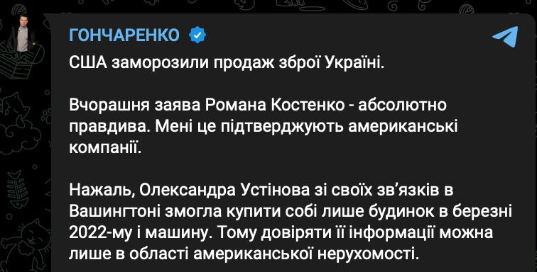 "США заморозили продаж зброї Україні. Учорашня заява Романа Костенка – абсолютно правдива. Мені це підтверджують американські компанії", - повідомив Гончаренко.